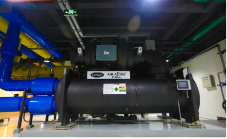 锦江宾馆的智慧高效能源中心,不同于以往低矮昏暗的地下“机房”,能源中心的空间宽敞明亮,黄蓝相间的大型设备、管道整齐排列、相互交错。能源中心的改造包括建设智慧高效能源中心、更新空调末端系统、优化照明与灯控系统、改善幕墙及外围护结构等内容。